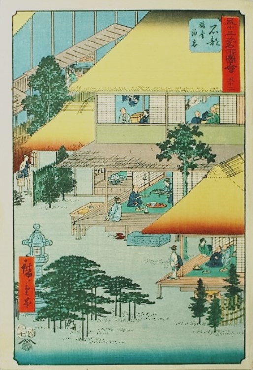 Hiroshige (1797 – 1898) Series: 53 statopns of the Tokaido Ishibe nr. 52, Tate-e edition Dat. 1855 Publ. Tsuta-ya €730